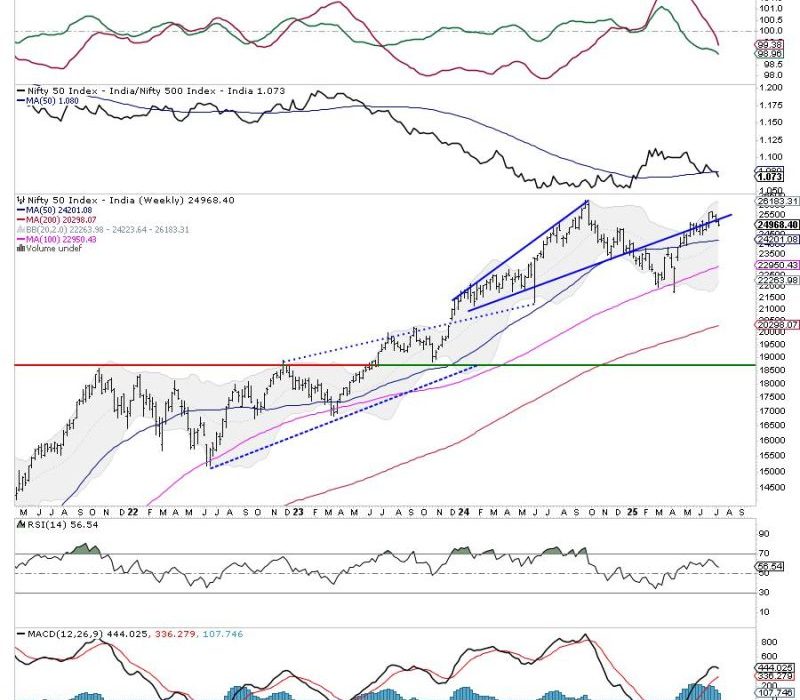 The Nifty traded in a broadly sideways and range-bound manner throughout the previous week and ended the week with a modest decline. The Index oscillated within a narrow 276-point range, between 25144.60 on the higher end and 24918.65 on the lower end, before settling mildly lower. The India VIX declined by 3.60% over the week